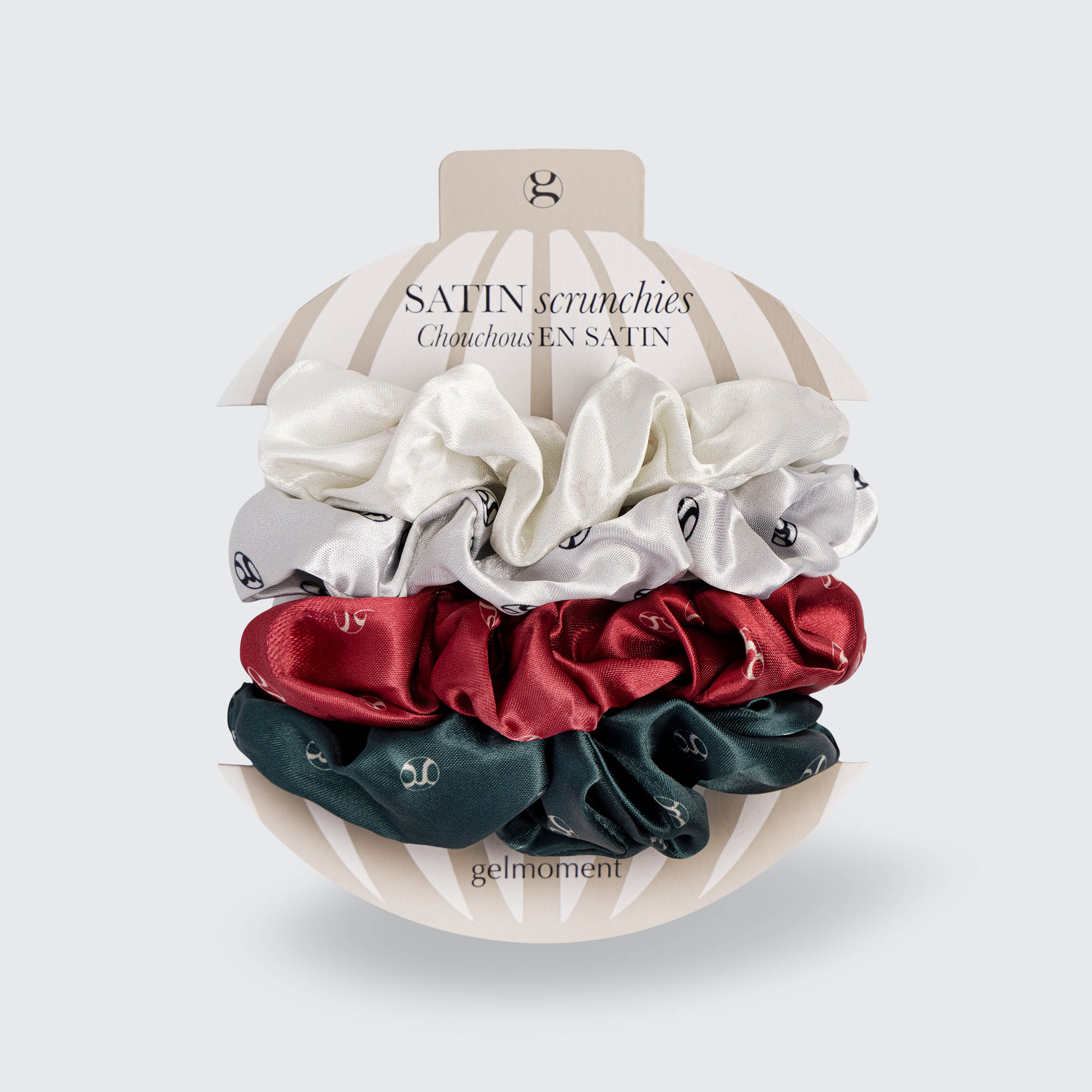 Sold as a set, all 4 colours are branded with polka-dots of the gelmoment ‘’g’’ in gold, black, or pale pink, a charming detail that makes our scrunchies especially unique.